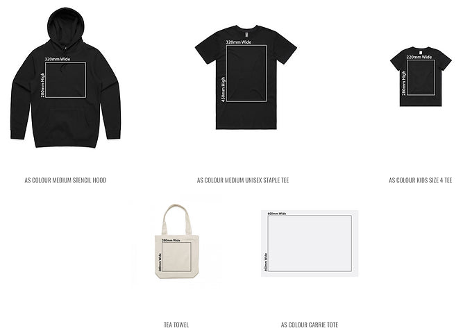 Although the garment you choose can limit the printable areas. This must be considered when printing a large artwork. You must size the artwork to the smallest garment in the order to ensure this works for all sizes. Provided below are some templates of our commonly used garments with approximate sizing to give you an idea of scale.