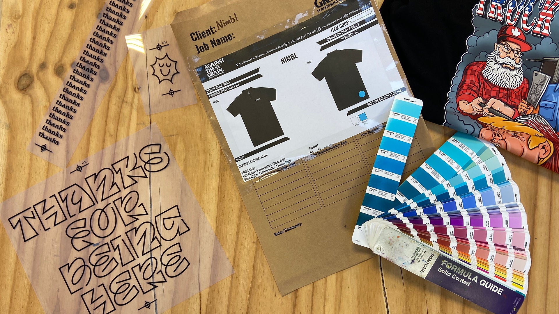 Or we can match as close to the artwork on the computer screen but it is important to note that Pantone Colours will vary from monitor to swatch book to the mixed ink. We allow a tolerance of 5% variance from the Swatch book. If you have a previously printed garment and want us to match a Pantone colour you could bring this in for us.
